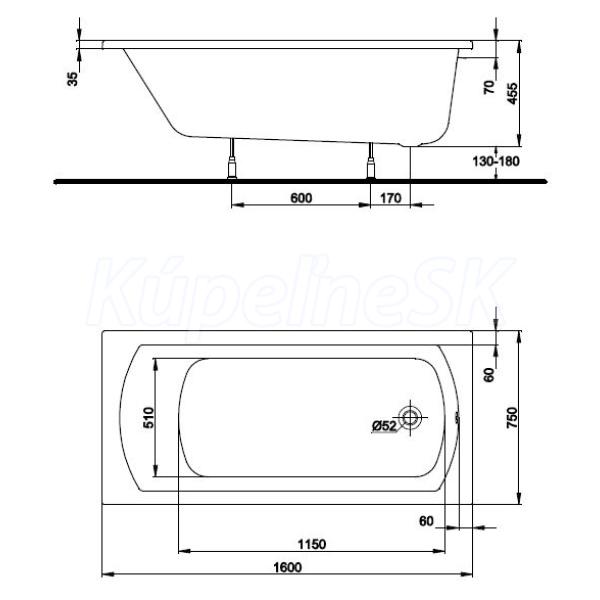 Pravouhlá akrylátová vaňa Kolo Perfect 160x75. Objem 250L. Dodávaná vrátane nôh,