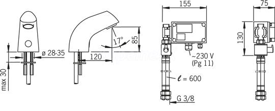 ?Bezdotyková umývadlová batéria so zmiešavacím ventilom, 230 VBatéria je vybavená kontrolou prietoku 0.1 l/s. Vopred nastavená doba dodatočného prietoku vody (po ukončení umývania) je 1 sekunda. Táto doba môže byť dodatočne zmenená. Ak je fotobunka zakrytá dlhšie ako 2 minúty, batéria uzavrie prietok vody automaticky. Výška výtokového ramena je 85 mm. Pre zmenu vopred nastavených parametrov je nutné použiť Oras Data Terminál. Čas dodatočného prietoku (doba dodatočného oplachu) 1 s (0 - 255 s)