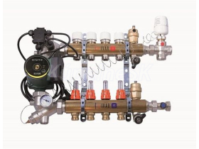 - zostava obsahuje: rozdeľovač s regulačnými prietokomermi, zberač s uzatváracími ventilmi, upevňovacie konzoly, termostatický ventil s termostatickou hlavicou a oddeleným ponorným teplotným čidlom k regulácii na konštantnú teplotu, regulačné šróbenie, obehové čerpadlo s elektroinštaláciou, poistný termostat, 2 ks automatických odvzdušňovacích ventilov, teplomer a 2 ks otočných vypúšťacích ventilov