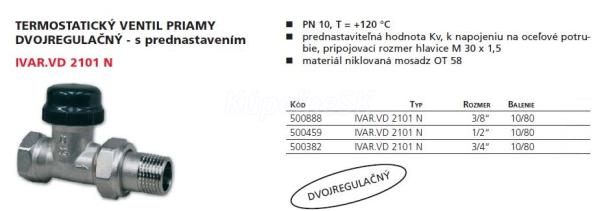Ivar VD 2101 N Termostatický ventil dvojregulačný-priamy-1/2" niklovaná mosaz CW617N 10/80 Ivar VD 2101 N Termostatický ventil dvojregulačný-priamy-1/2" niklovaná mosaz CW617N 10/80