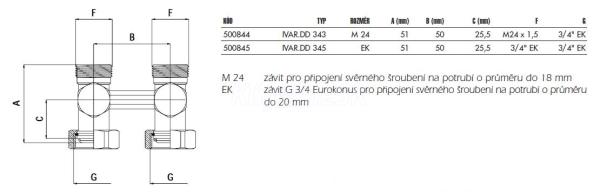 uzatváratelný, 3/4" Eurokonus alebo M 24, pripojenie na medené alebo plastové potrubie pomocou zverných šróbení TR (meď), TA (ALPEX) a TP (plast)