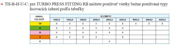 Fittingy pre plasto-hliníkové rozvody pitnej vody a kúrenia. Pre TURBO PRESS FITTING RB môžete používať všetky bežne používané typy lisovacích čelustí TH-B-H-U-C,Jedno stlačenie so správne nasadenými čelusťami Vám zabezpečí nielen pevnosť celej sústavy, ale aj 100 %-nú nepriepustnosť „O-krúžkov“. Spojenie je nerozoberateľné a odoláva vysokým tlakom aj pnutiu.