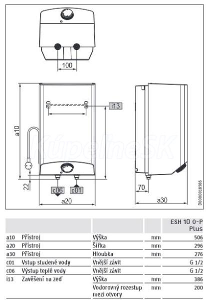 Stiebel Eltron ESH10O-PPlus Elektrický ohrievač vody s nádržkou na 10l, nad umýv, EO10N Typ ohrevu elektrický Montáž nad umývadlo Objem (l) 10 Typ inštalácie závesný Regulácia teploty Áno Príkon ohrievacieho telesa (kW) 2 Hmotnosť (kg) 8 Šírka (cm) 29.6 Výška (cm) 50.6 Hĺbka (cm) 27.6 Energetická trieda A -Malý zásobník s 10 litrami -Tlaková prípojka na zásobovanie jedného alebo viacerých odberných miest -Plynulá voľba teploty v rozsahu od cca 35 °C do 82 °C s možným obmedzením teploty -Veľká kapacita teplej vody, ideálne riešenie pre kuchyňu a kúpeľňu -Montáž nad umývadlo -Úsporná vďaka vynikajúcej tepelnej izolácii Indikátor prevádzkového stavu/kontrolka Malý zásobník ESH 10 Plus – menej znamená viac. Praktický malý zásobník ESH je správne riešenie pre tesne usporiadané odberné miesta. Pretože tlakový prístroj sa nielen že montuje s úsporou miesta, ale sa aj jednoducho ovláda. Malá až priemerná spotreba teplej vody v kuchyni a v kúpeľni môže byť ideálne zabezpečená malým zásobníkom vďaka plynulej regulácii teploty. Okrem toho sa hodí aj na krátke sprchovanie. V prípade malého zásobníka ESH rozhoduje nie len výkon. Presvedčí aj minimálna spotreba pohotovostného prúdu vďaka vysokokvalitnej izolácii.