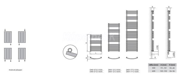oblý 1212/600 mm (v / š), priemer trubky 22 mm max.prevádzková teplota 110°C samostatne zapojiteľný do elektrickej siete ako samostatné el.vykurovacie teleso v prevedení biela, dodávaný ako komplet s výhrevnou antikoroznou tekutinou a el.výhrevnou tyčou Mini s regulátorom.