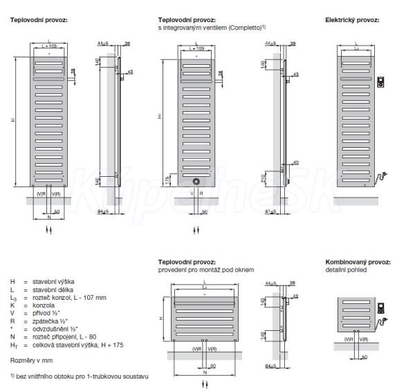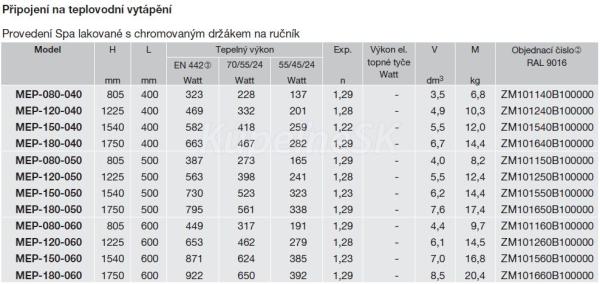 profilu bez viditeľných zvarových spojov. Vykonani MEP dodávané s rovnomerne usporiadanými vodorovnými rúrkami a chrómovaným držiakom na uterák. Tepelné výkony merané podľa EN 442 s označením CE. 4x spodné pripojenie pre prívod / spiatočku: stredové pripojenie 2 x 1 " s rozstupom 50 mm a vonkajšie ľavé a pravé pripojenie, odvzdušňovací ventil.