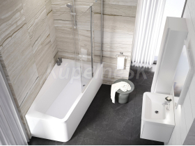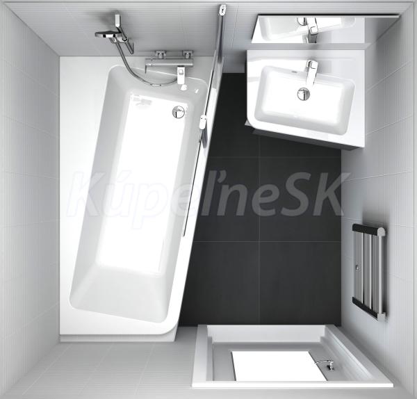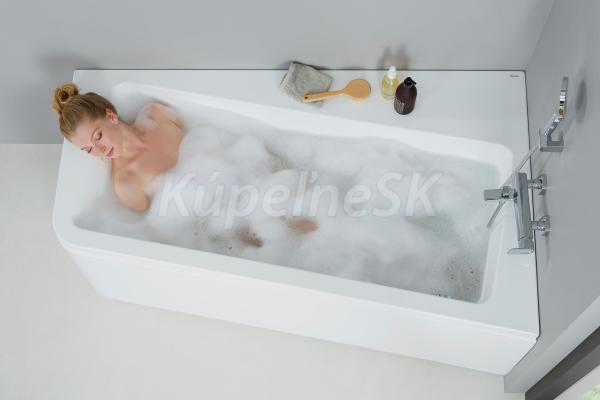 Asymetrická vaňa 10° kombinuje pohodlie vane a praktickosť sprchového kúta. Pootočením vzniká priestor, ktorý môžete využiť ako sedadlo na pohodlné sprchovanie alebo na odloženie kozmetiky. Pravý variant.