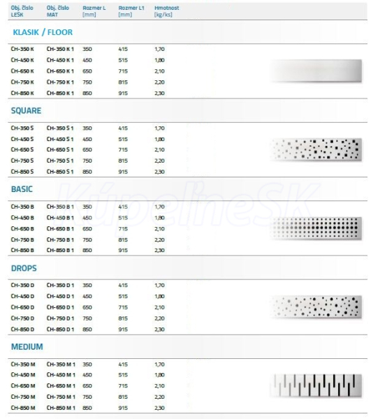 CHUDEJ, MEDIUM Podlahový lineárny plastový žľab 350 mm, lesklý+rošt
