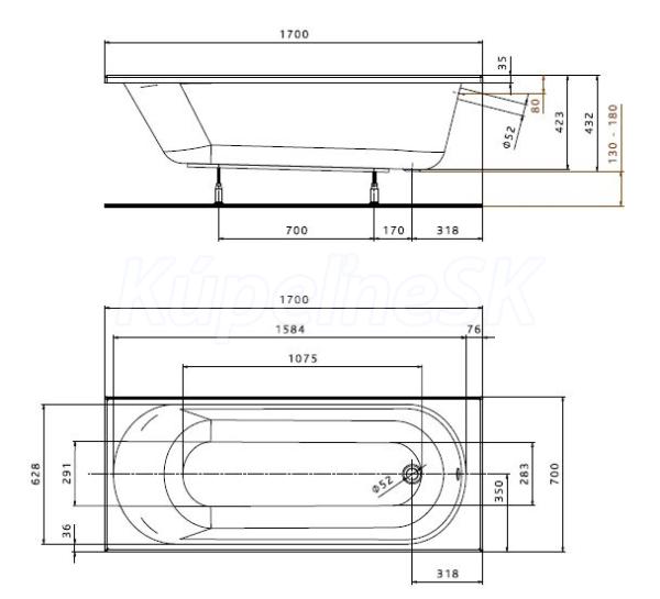 Pravouhlá akrylátová vaňa Kolo Opal Plus 170x70. Objem 190L. Dodávaná vrátane nôh, bez čelného panelu.