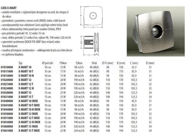 Kúpeľňový axiálny ventilátor s ,výbavou TIMER (T) S ,dobehovým časovačom (nastaviteľná doba 3-15 minút) Spúšťa sa tlačidlovým vypínačom a po uplynutí doby sa automaticky vypne Čelný panel z ,nerez ocele Výkon 320 m3 / h Napájanie 230 V ,/ 50 Hz Možnosť inštalácie na stenu, do stropu alebo do okna Aerodynamický tvar odťahové časti zaisťuje veľmi tichý chod Ľahko odnímateľný čelný panel pre jednoduché čistenie, IPX4 Max. dĺžka potrubia 3,5 alebo 8 m Upevnenie systémom QUICK FIX GRIP (bez vŕtania) alebo hmoždinkami Ľahko prístupná svorkovnice - odklopením krytu na čelnej doske So spätnou klapkou
