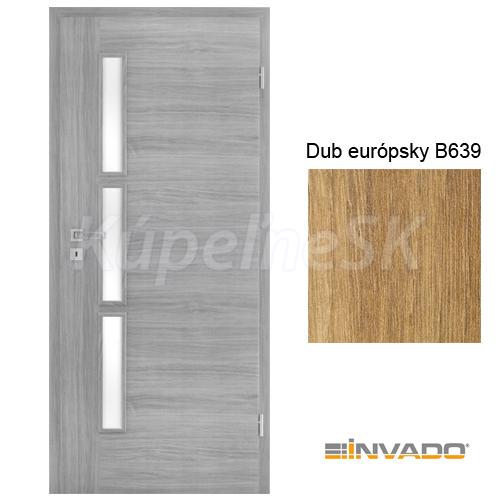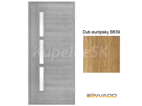 Kvalitné interiérové dvere na povrchu dýhované doskou HDF s dekoračnou fóliou. Všetky dvere Invado sú dýhované unikátnou technológiou, kedy sa dýha zakladá na spojovacej hrane falcu, vďaka čomu nie je povrch dverí ničím narúšaný, pôsobí ucelene a esteticky. Rám je z pevnej dosky MDF. Dvere sú osadené bielymi pozinkovanými zavesmi. Zámok dverí je možné si zvoliť ako bežný medziizbový zámok, ako WC zámok alebo ako dozický zámok. Celková výška dverí je 1990mm. Dvere sú osadené matným sklom.