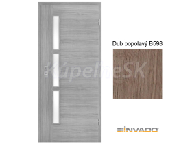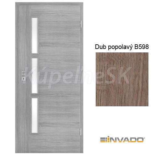 Kvalitné interiérové dvere na povrchu dýhované doskou HDF s dekoračnou fóliou. Všetky dvere Invado sú dýhované unikátnou technológiou, kedy sa dýha zakladá na spojovacej hrane falcu, vďaka čomu nie je povrch dverí ničím narúšaný, pôsobí ucelene a esteticky. Rám je z pevnej dosky MDF. Dvere sú osadené bielymi pozinkovanými zavesmi. Zámok dverí je možné si zvoliť ako bežný medziizbový zámok, ako WC zámok alebo ako dozický zámok. Celková výška dverí je 1990mm. Dvere sú osadené matným sklom.
