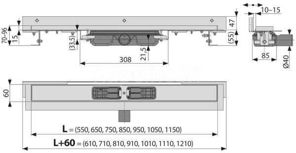ALCA (Alca Plast / Alca Drain) Flexible Low-Podlahový žľab s okrajom pre perforovaný rošt a s nastaviteľným límcom ku stene APZ104-1050