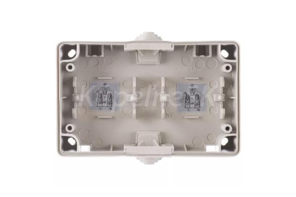 - výrobok: dvojitá zásuvka s ochrannými kolíkmi a krytkami s pripojením