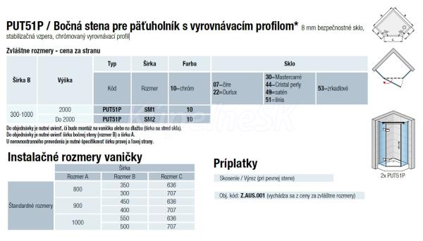 Ronal - Sanswiss PUR PUT51P Bočná stena pre päťuholníkový sprchový kút s vyrovnávacím profilom, 8 mm bezpečnostné sklo,stabilizačná vzpera, chrómovaný vyrovnávací profil, ATYP-ické rozmery širka od 45 do 100 cm, výška 200 cm, Farba Chróm / Sklo Satén