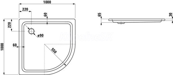 Sprchová vanička štvrťkruh, rádius 550mm Veľkosť 1000 x 1000 x 65 mm Laufen Sprch. van. PLATINA-100 bílá