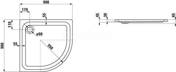 Laufen SOLUTIONS štvrťkruhová sprchová vanička 90x90x4,5cm, R55, akrylát, biela