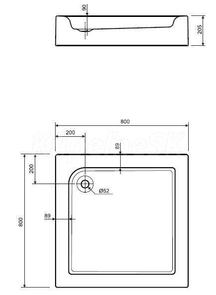 Kolo Standard Plus štvorcová vanička s panelom 80x80x9cm, hĺbka: 9 cm, odtok: 52 mm, celková výška: 20,5 cm. Nie je samonosná, inštalácia na nožičky.