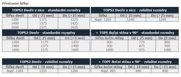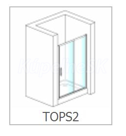 Sprchové kúty TOPS2 sú tvorené jednodielnymi posuvnými dvermi s pevnou stenou v rovine s dvermi. Dvere je možné inštalovať s otváraním vpravo alebo vľavo a je možné je odklopiť pre ľahké čistenie.