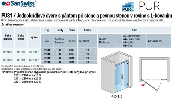 Ronal - Sanswiss PURmax PU31 Jednokrídlové dvere do niky alebo sprchového kúta s pántom pri stene a pevnou stenou v rovine s L-kovaním, súčasťou je 8mm bezpečnostné sklo, stabilizačná vzpera, chrómované pánty integrované, otváranie von, magnetické tesnenie, aluchrómová prahová lišta, celková šírka do 200 cm, šírka dverí do 90 cm, výška do 200cm, Pravé , Farba Chróm , Sklo Línia