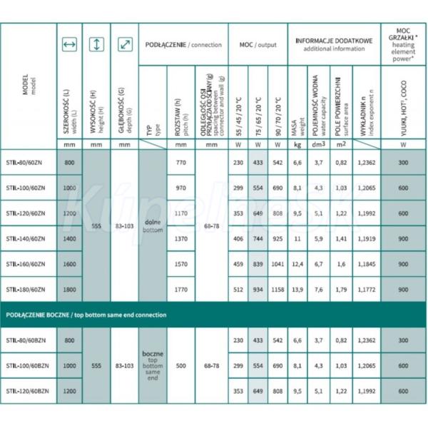• 1000 × 555 mm, výkon 554 W, vykurovacia tyč 600 W - pripojenie klasické (na rozstup) / stredové 50 mm