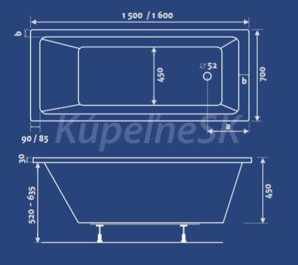 CA-PLAST 301607003 LENKA laminátovo-živicová minerálno-dolomitovo-vápencová vaňa s so sanitárno-hygienickou povrchovou úpravou Gelcoat 160x70, povrch Gelcoat,nosnosť 500kg!