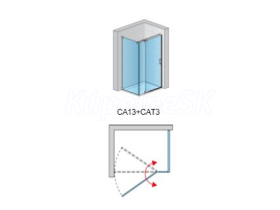 Obojstranne jednkrídlové dvere s krátkou pevnou stenou v rovine na strane pántov do niky/sprchového kúta s čelným (kombinácia s pevnou stenou CAT1 / CAT3) alebo s rohovým vstupom (kombinácia s ďalšími (opačnými) dverami CA13), prípadne tvoriace čelný vstup trojstranného sprchového kúta (kombinácia s pevnými stenami CAT1 a CAT3).