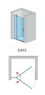 Obojstranne jednkrídlové dvere s krátkou pevnou stenou v rovine na strane pántov do niky/sprchového kúta s čelným (kombinácia s pevnou stenou CAT1 / CAT3) alebo s rohovým vstupom (kombinácia s ďalšími (opačnými) dverami CA13), prípadne tvoriace čelný vstup trojstranného sprchového kúta (kombinácia s pevnými stenami CAT1 a CAT3).