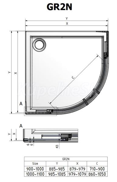 Štandardný rádius je R550, presná výška vrátane kotviacich elementov činí 2015 mm. Štvrťkruhový sprchovací kút GR2N je vyrábaný v dvoch štandardných veľkostiach.