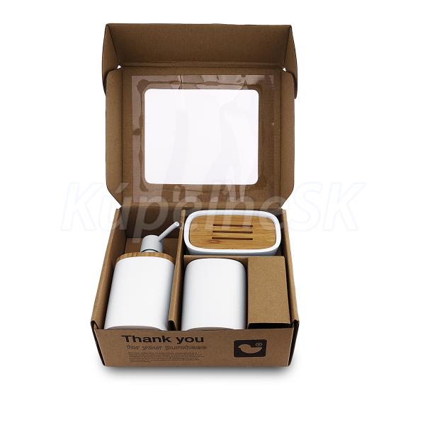 Dárkový set s dávkovačem, mýdlenkou a dózou na kartáčky. Materiál polyresin, bambusové dřevo.