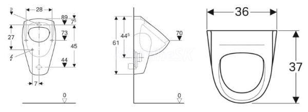 Pisoár Geberit Selnova, prívod zozadu, odtok dozadu: T=37cm, Odtok=Dozadu, Prívod=Vzadu, Biela