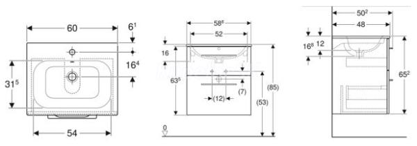 Súprava nábytkového umývadla Geberit Selnova Square s úzkym okrajom, so skrinkou pod umývadlo, dve zásuvky: B1=58.8cm, T=50.2cm, Otvor pre batériu=V strede, Prepad=Viditeľné, Láva