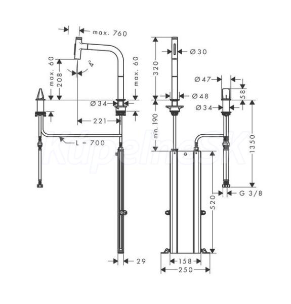 hadice sa vyťahuje až 76 cm a zaručuje príjemnú prácu a voľnosť pohybu v okolí drezu