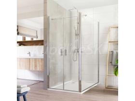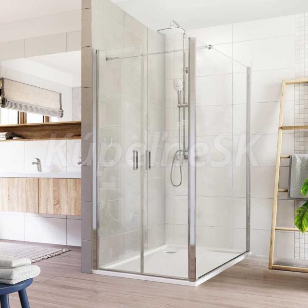Hliníkové profily vo farbe chróm, lietacie dvere a pevný diel, sklo Číre, sila skla 6 mm, obdĺžnik, 1000 (dvere) x 1200 (pevný diel), výška 1900 mm.