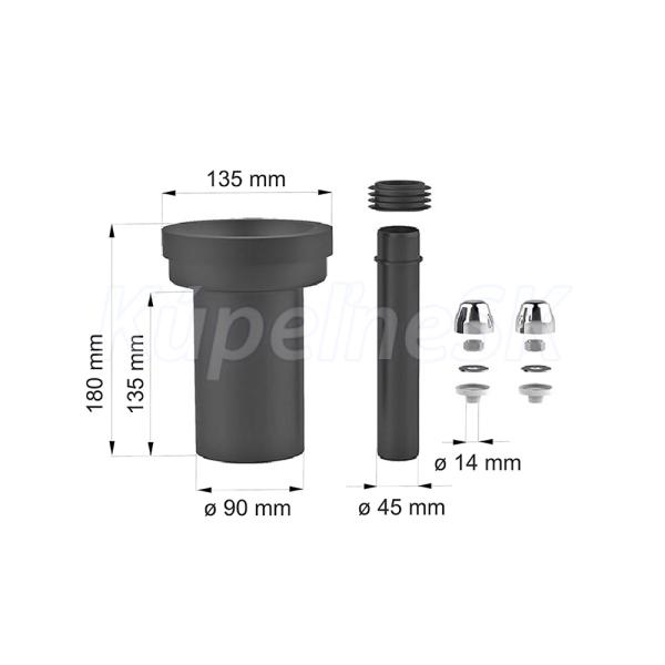 Pripojovacie súprava, DN 80/D 90, pre závesné WC, materiál PP. Odtoková rúrka DN 80 /D90, dĺžka 180 mm. Prívodný rúrka O 45 mm s gumovou manžetou.