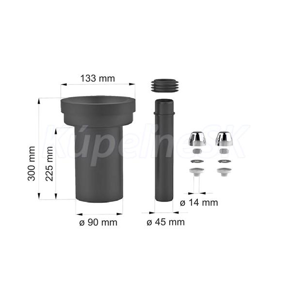 Prípojná súprava pre závesné WC, zvárateľná, materiál PE. Odtoková rúrka DN D80 / D90, dĺžka 300 mm. Prívodný rúrka O 45 mm s gumovou manžetou.
