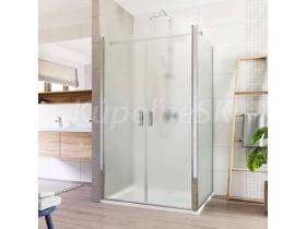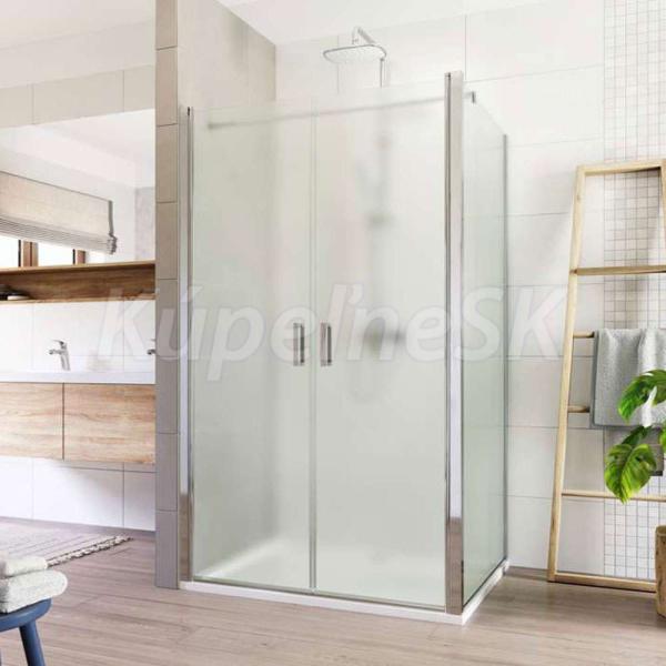 Hliníkové profily vo farbe chróm, lietacie dvere a pevný diel, sklo Point, sila skla 6 mm, obdĺžnik, 1000 (dvere) x 900 (pevný diel), výška 1900 mm.