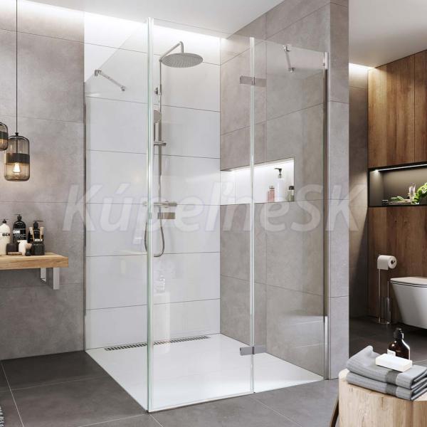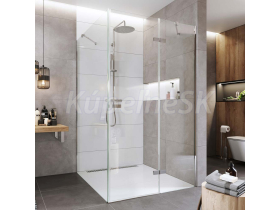 Hliníkové profily vo farbe chróm, sklo Číre, hrúbka skla 6/6 mm, obdĺžnik, 1000 (dvere) x 800 (pevný diel), výška 2000 mm.