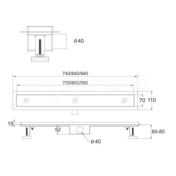 Odtokový sprchový žľab, 90x7 cm, nerez, vr. roštu STRIP a nerezového vnútra sifónu.