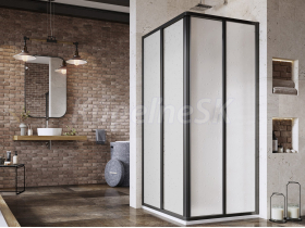 1/2 rohového sprchového kúta Supernova v čiernom vyhotovení a s výplňou z umelej hmoty s dekorom Pearl. S ochrannou vrstvou Ravak AntiCalc®. Posuvný systém otvárania. Kompletný výrobok je zložený z dvoch sprchových dverí.