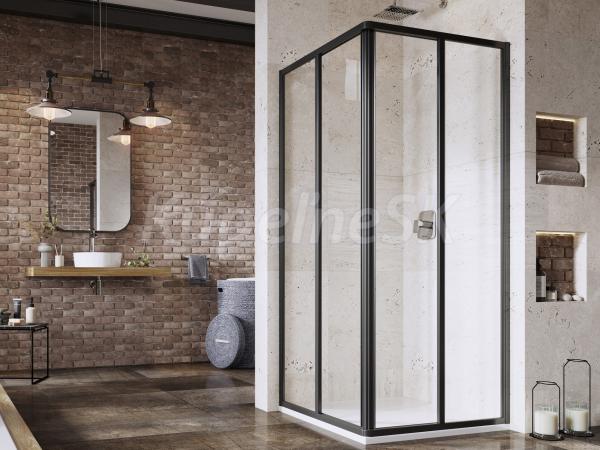 1/2 rohového sprchového kúta Supernova v čiernom vyhotovení a s výplňou z číreho skla s ochrannou vrstvou Ravak AntiCalc®. Posuvný systém otvárania. Kompletný výrobok je zložený z dvoch sprchových dverí.