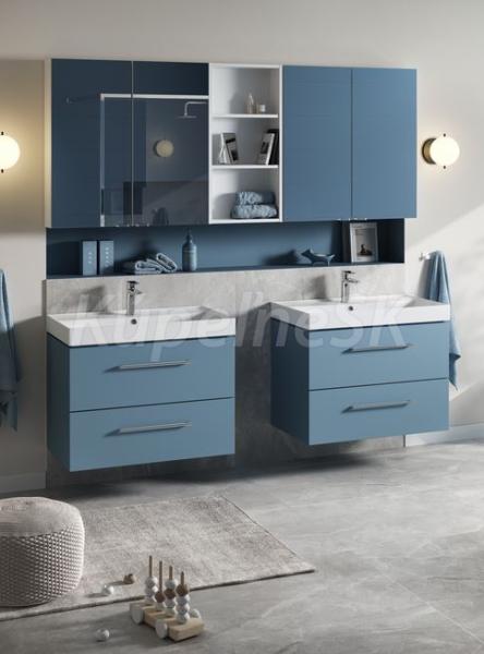 Kúpeľňový nábytok LARGA je dostupný v troch farebných variantoch: biela, šedá a modrá, ktoré je možné konfigurovať s pracovnými doskami rôznych farieb. Nábytok dopĺňajú kovové úchytky, gombíky a nohy v zlatej, čiernej a striebornej farbe.