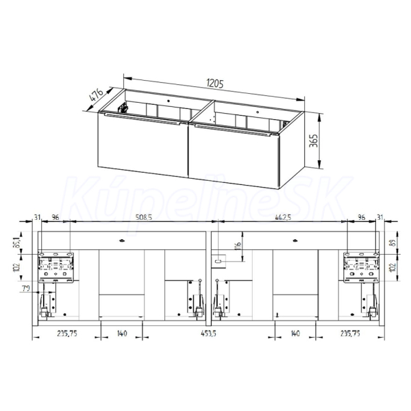 Mailo, kúpeľňová skrinka 1205x365x476 mm, spodná, biela lesk, 2 zásuvky. Možno kombinovať s umývadlom, popr. s kúpeľňovou doskou na skrinku.