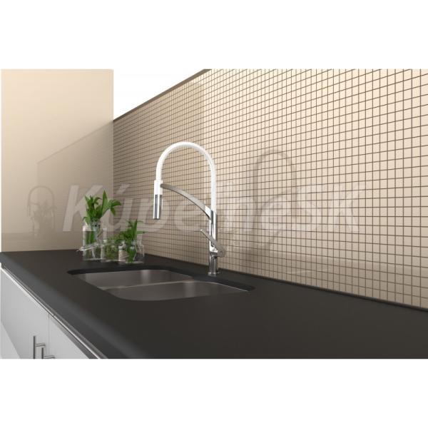 Drezová vodovodná batéria ULTIMA U-50 vo farbe chróm/biela farba s vysokým flexibilným masívnym ramenom s hadicou (v bielej farbe) a nastaviteľnou sprškou. ULTIMA U-50 v mnohom prekračuje strednú kategóriu, do ktorej sa radí svojou priaznivou cenou. Batéria je moderne designovaná.