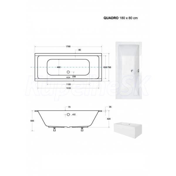 Tvarovo jednoduchá vaňa QUADRO SLIM s veľmi nízkou hranou (iba 15 mm) as ostrými zvýraznenými hranami, oslovi všetkých zákazníkov, ktorí uprednostňujú rovné línie. Vaňa QUADRO SLIM s veľkými rozmermi , ktorá ponúka obojstranné veľmi pohodlné ležanie . Nožičky k vani je nutné dokúpiť. Túto vaňu je možné za príplatok objednať s povrchovou úpravou BeSafe*.
