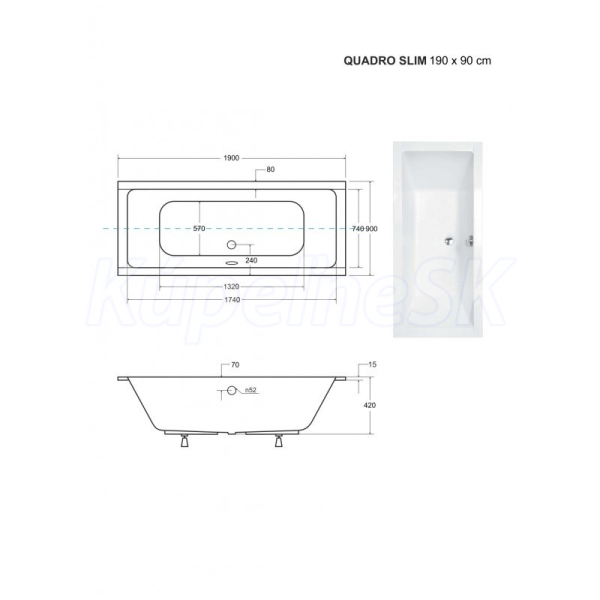 Besco QUADRO SLIM Vaňa obdĺžniková akrylátová 190x90cm, 225 l, Biela
