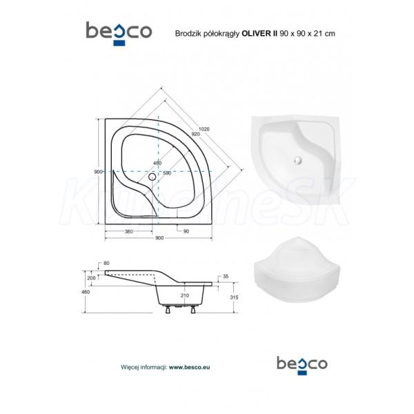 Besco OLIVER II Štvrťkruhová sprchová vanička akrylátová 90x90x21cm, R550 Biela