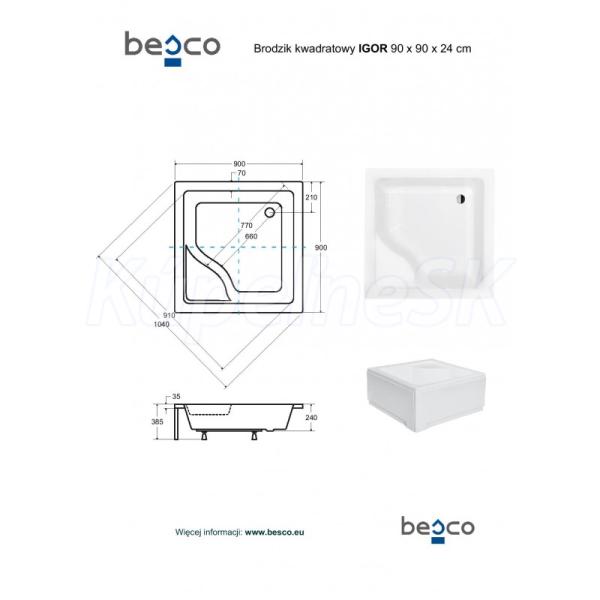 Besco IGOR Štvorcová sprchová vanička akrylátová 90x90x24cm, Biela