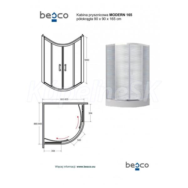 Štvrťkruhový sprchovací kút MODERN 165 vyniká kvalitným spracovaním hliníkového rámu vo farbe lesklého chrómu, ktorý spolu s magnetickým dovieraním zaistí jeho dokonalú tesnosť. Maximálne bezpečie zaistí bezpečnostné sklo (6 mm) a ľahký posun ložiskové pojazdy . Sprchovací kút s výškou 165 cm je vhodný pre neštandardné priestory kúpeľní a pre menšie kúpeľne. Zástena je určená pre vaničky DIPER I a DIPER II, OLIVER I a OLIVER II, SLIVEN. Sprchovací kút je dodávaný BEZ sprchovej vaničky.