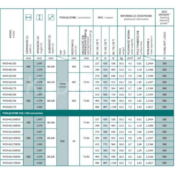 - 500 × 1047 mm, výkon 508 W (vykurovacia tyč 600 W)