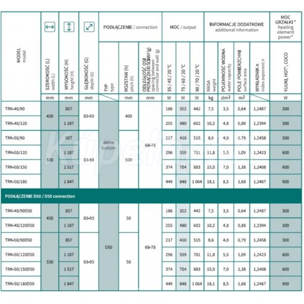 - 530 × 1187 mm, výkon 542 W, (vykurovacia tyč 600 W)